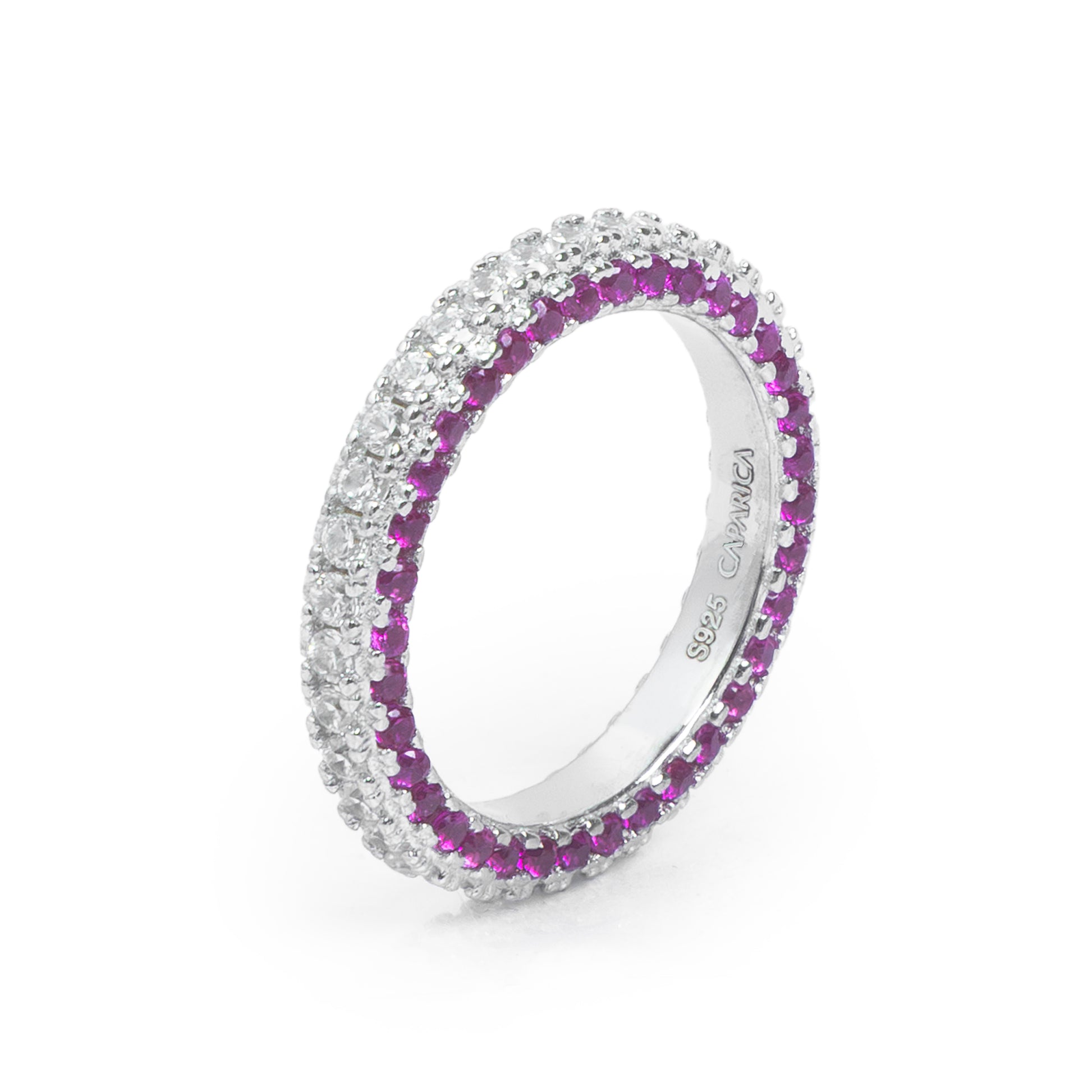 -A slim eternity band set with bright white stones and a full inner row of vivid pink gems. Clean, feminine, and perfect for stacking.